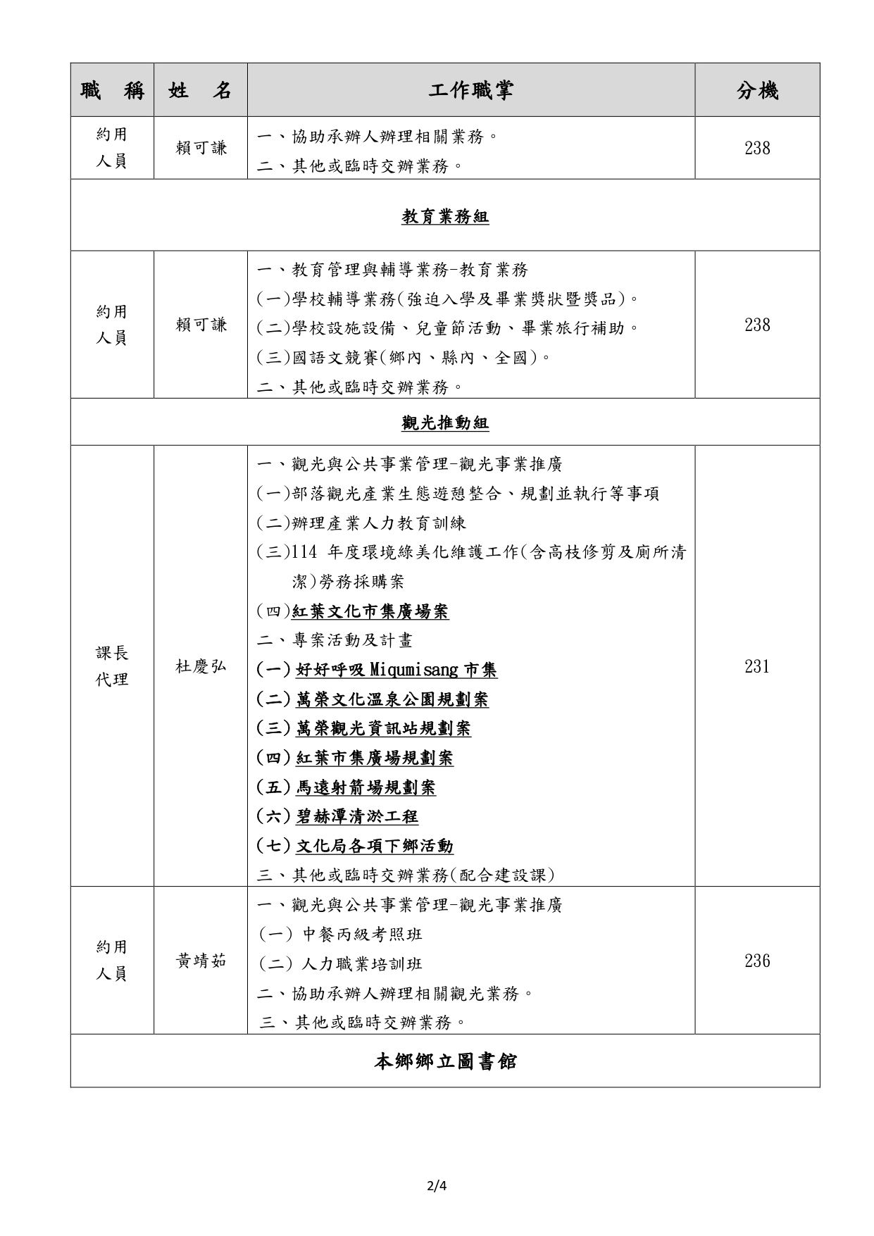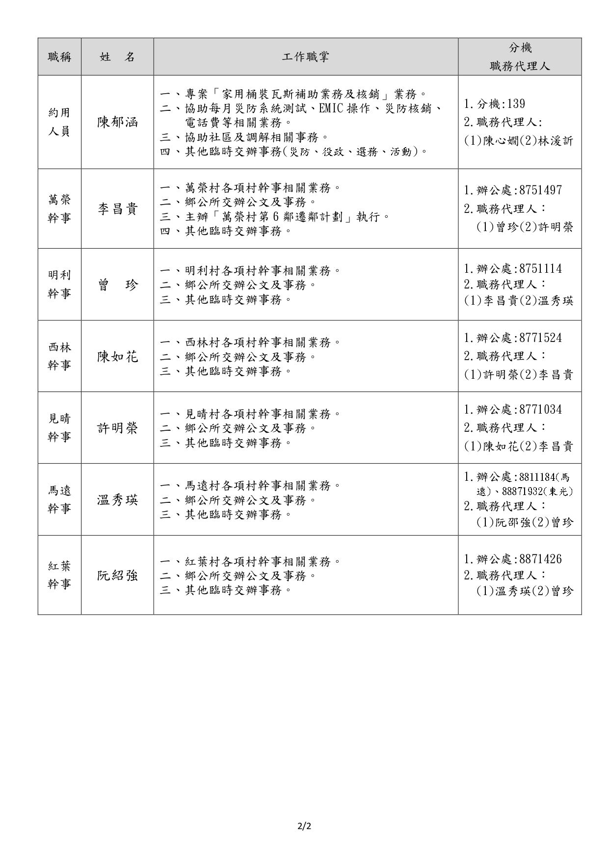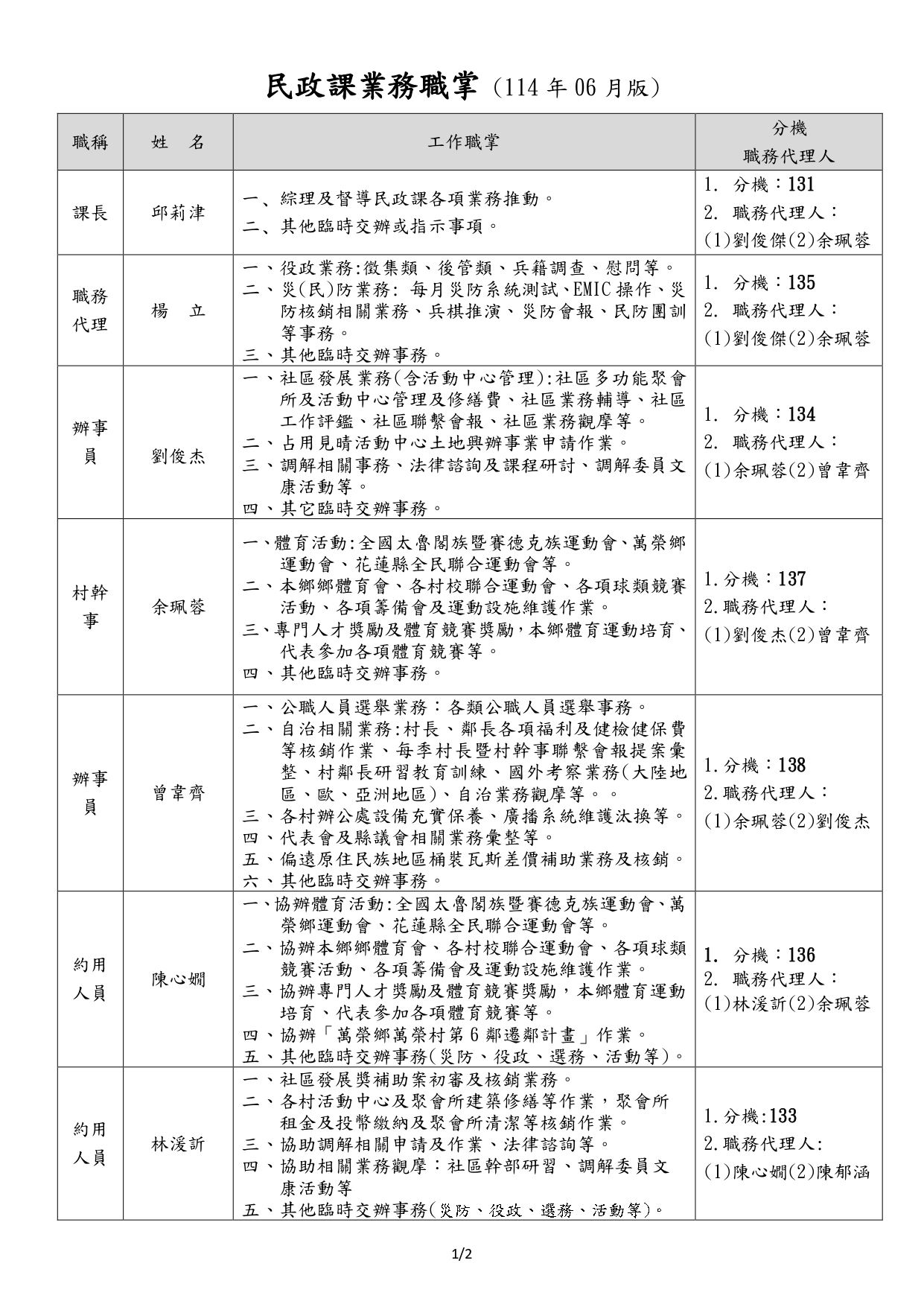 民政課掌理事項:自治行政、調解行政、兵役行政、一般民政、社區發展、公職人員選務工作、災害防救及協辦民防等事項。