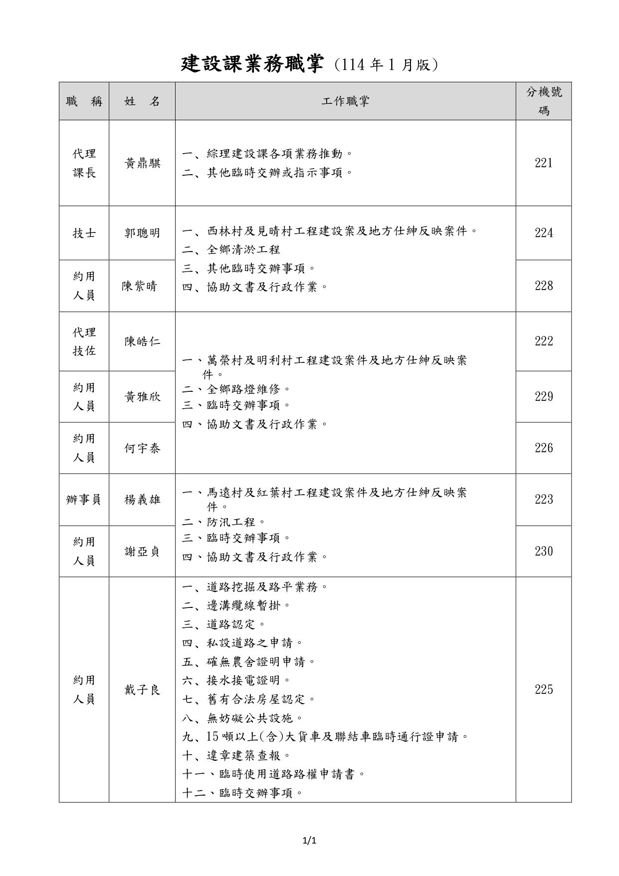 建設課掌理事項:土木工程、都市計畫、公共建設管理、交通、水利、違章建築查報處理、公用事業、雨水汙水下水道工程、小型排水設施、災害搶修工程等事項。