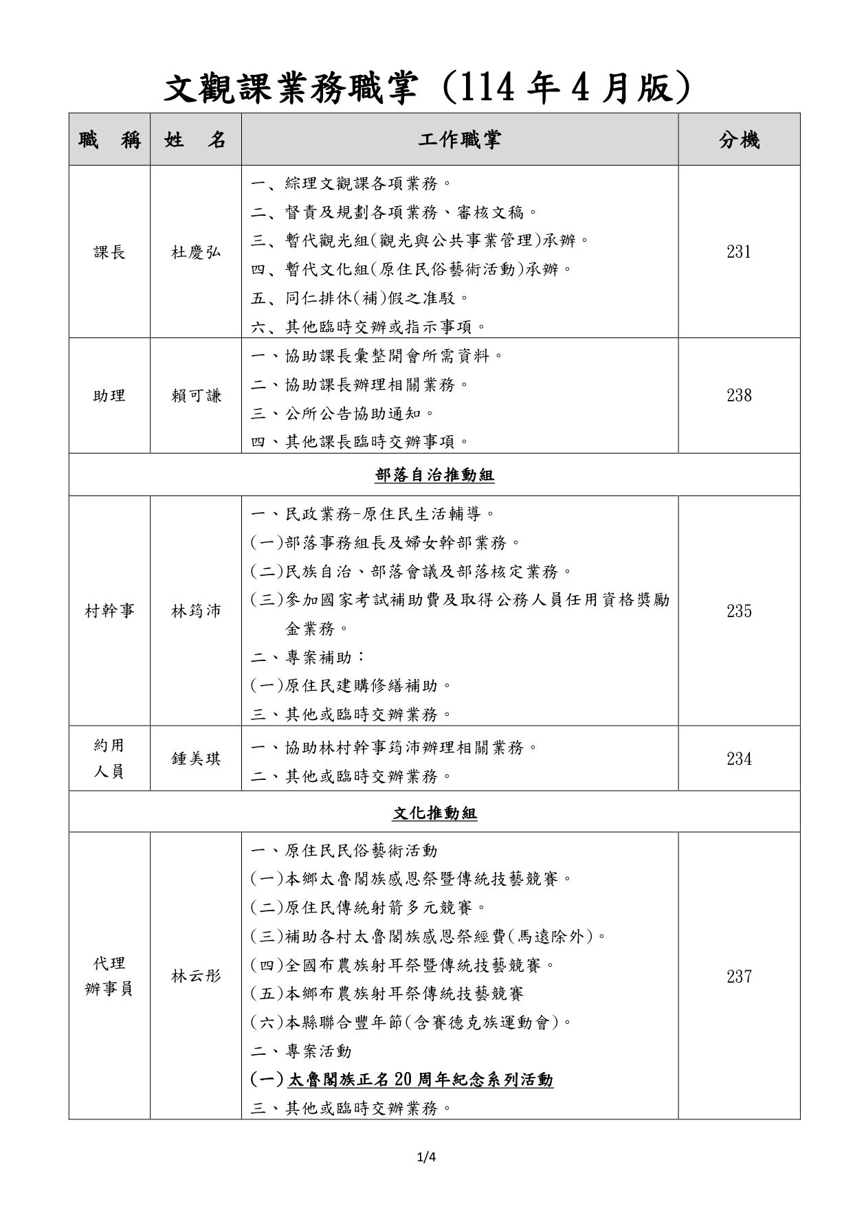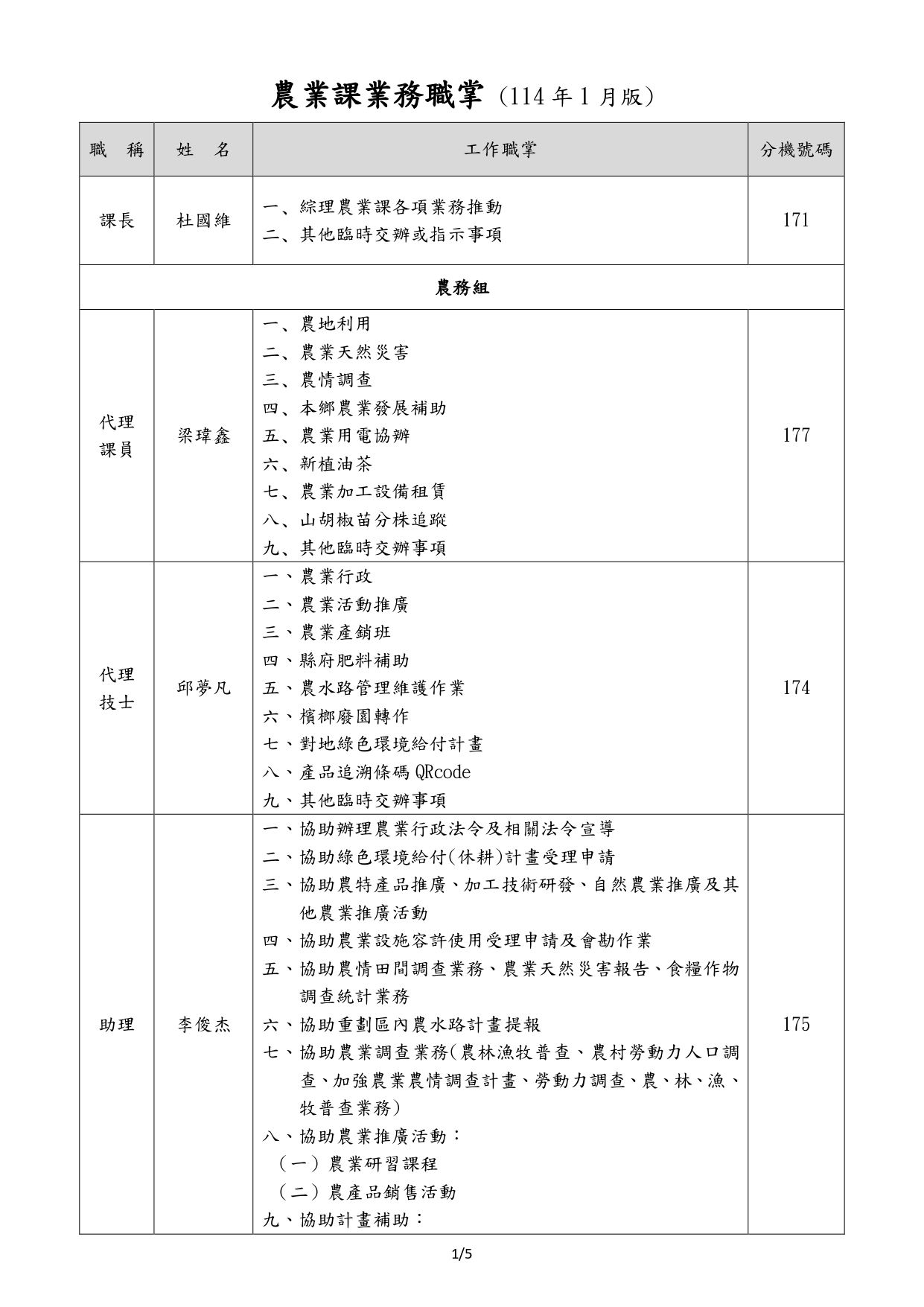 農業課掌理事項:原住民保留地管理、林業經營管理、農業經營管理、畜牧經營管理、礦業、山坡地保育及農業天然災害救助等事項。