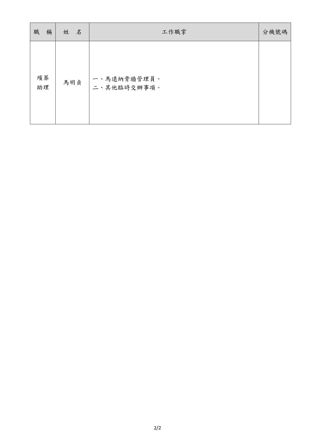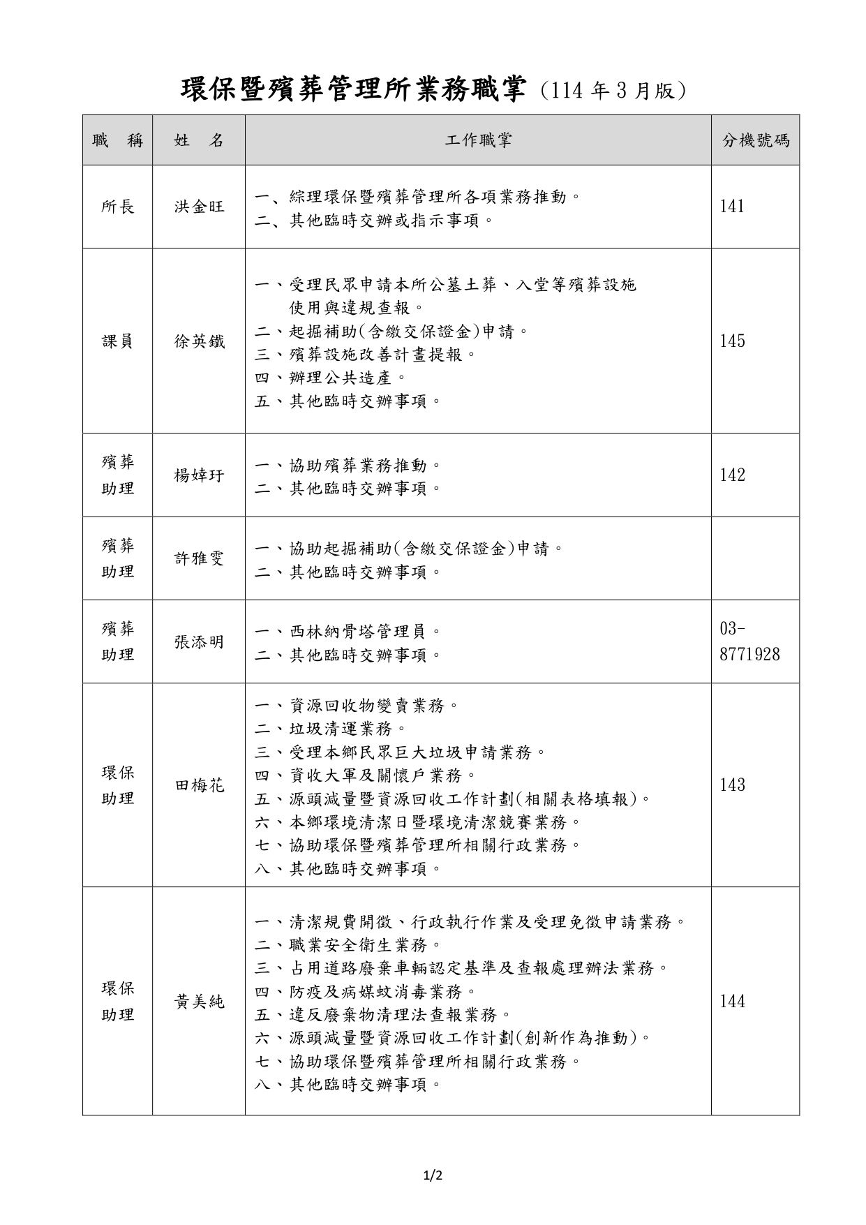 環保暨殯葬管理所掌理事項:環保衛生、綠美化維護、公共造產、禮俗宗教、殯葬設施設置及管理等事項,並執行上級交辦事項。